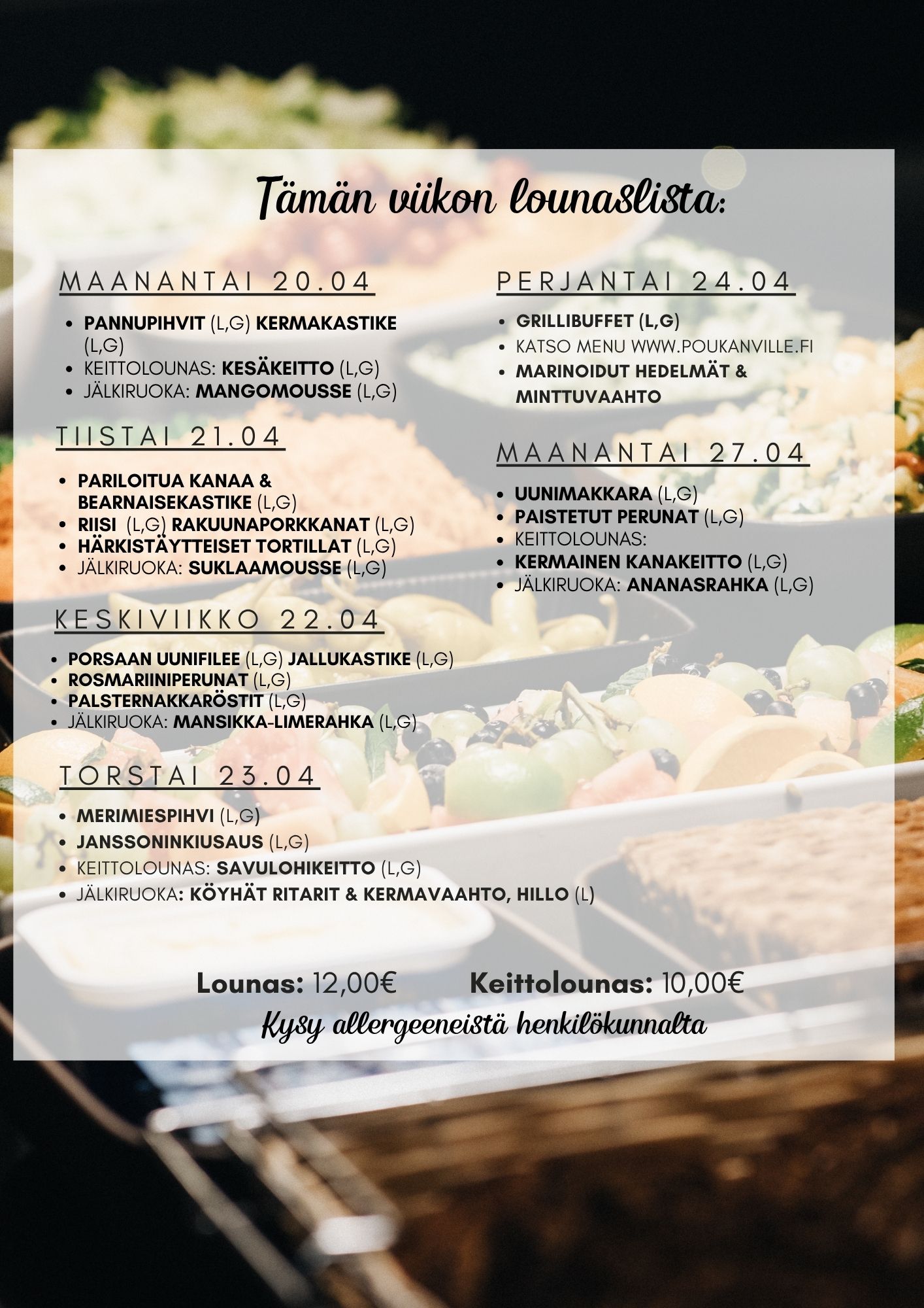 Poukanvillen lounasravintola palvelee arkisin klo: 09.00-13.30. Lounas sisältää runsaan salaattipöydän, ruokajuoman sekä lämpimän ruoan valintasi mukaan! Hintaan sisältyy lisäksi päivän jälkiruoka sekä kahvi/tee